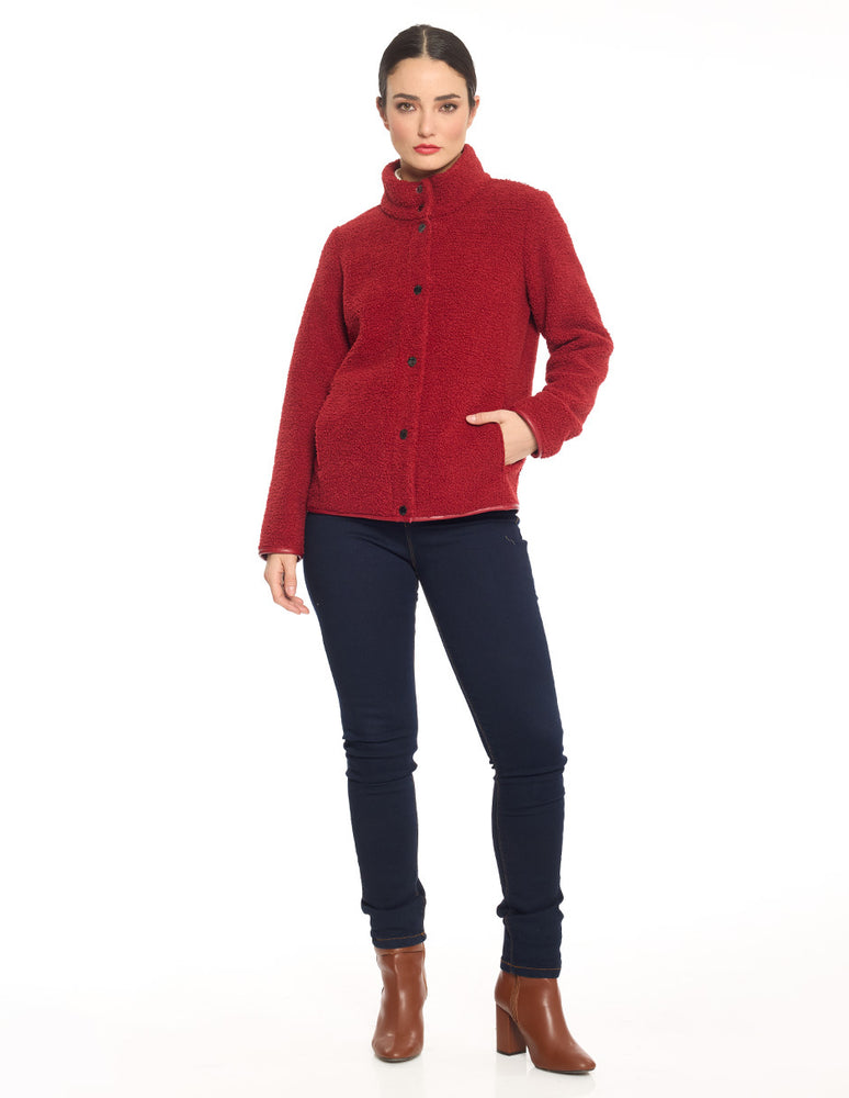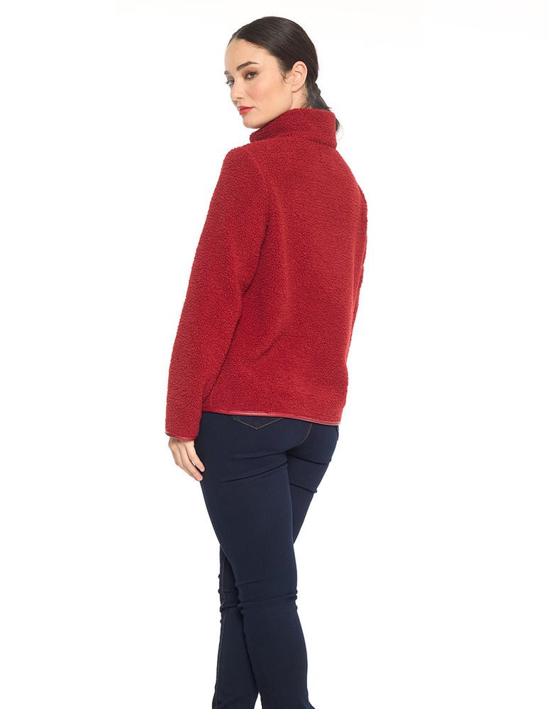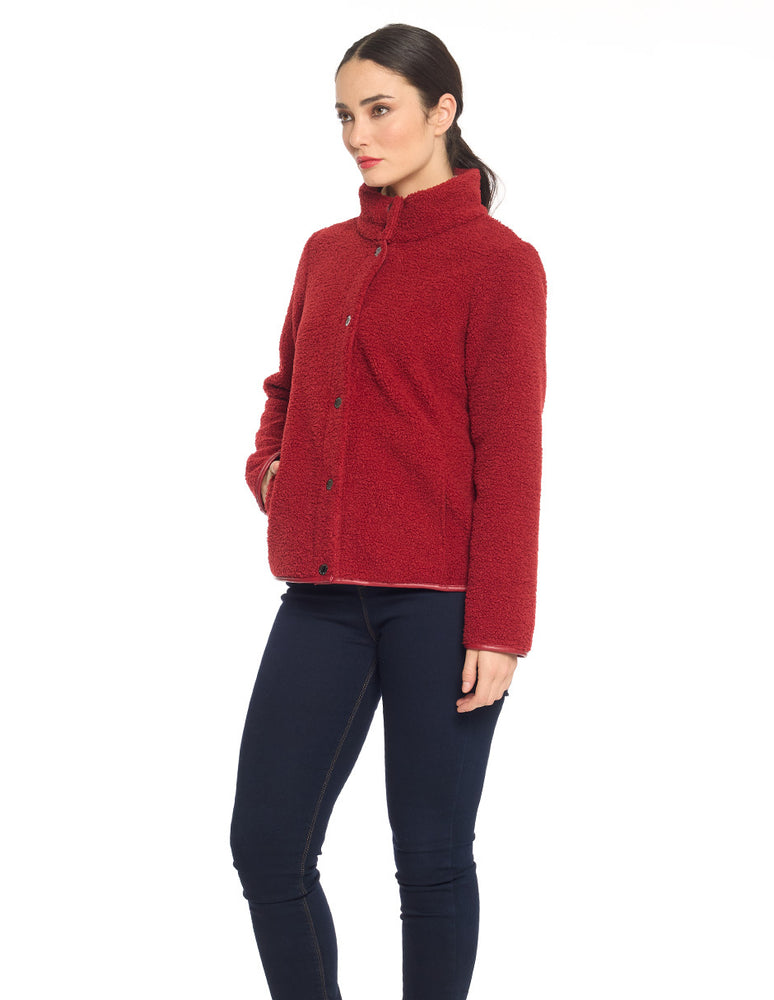 Chamarra borrega, cuello alto, broches al frente, bolsas entre el corte de costado, manga larga con detalle de bies en tacto piel en puños y ruedo