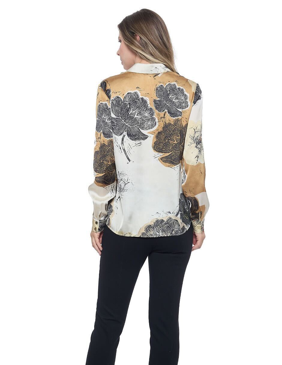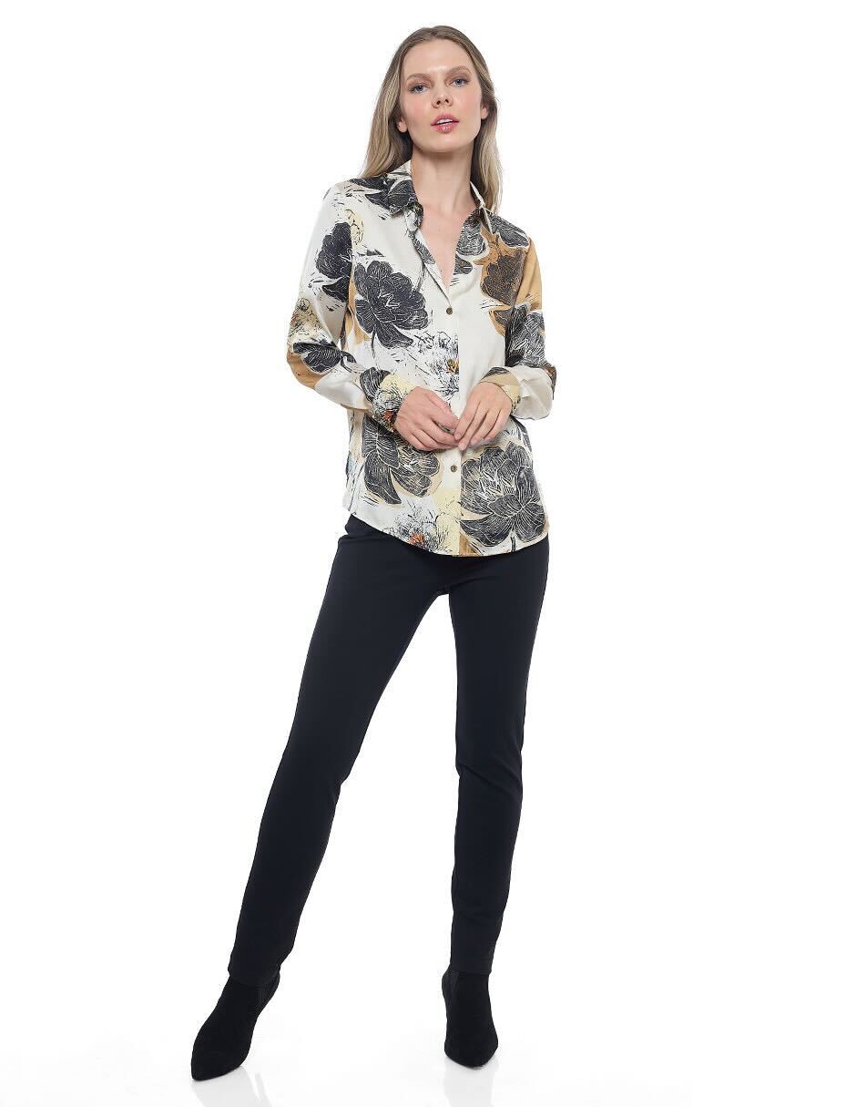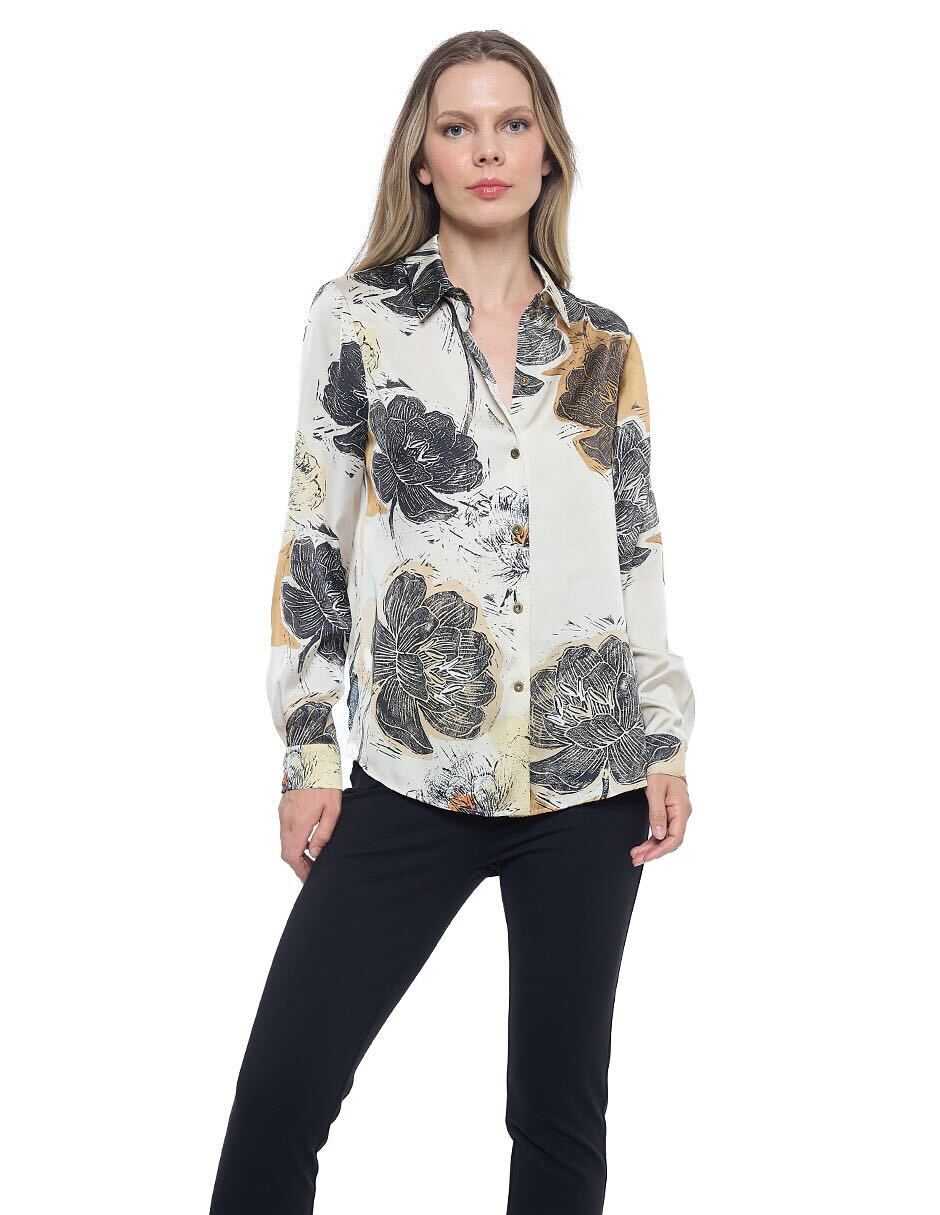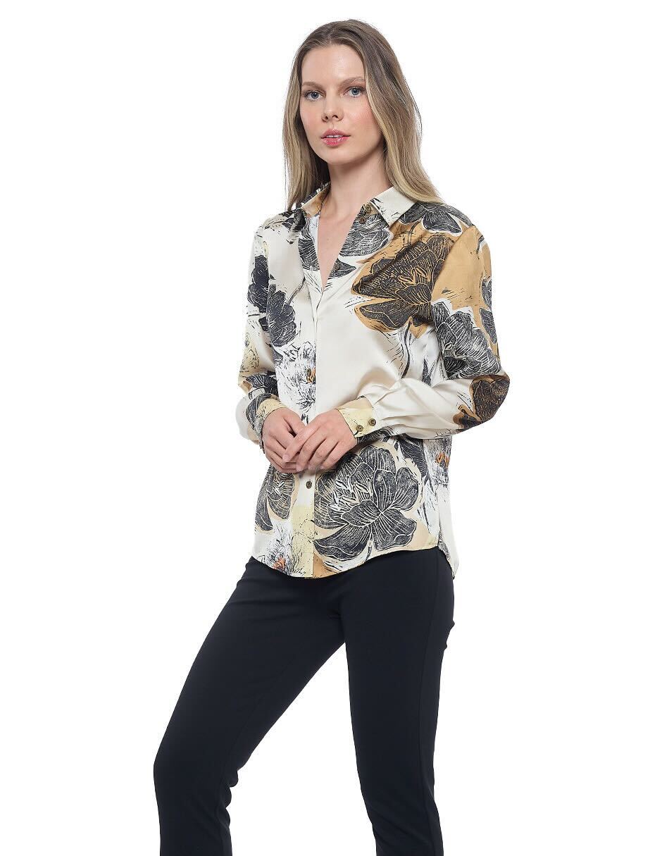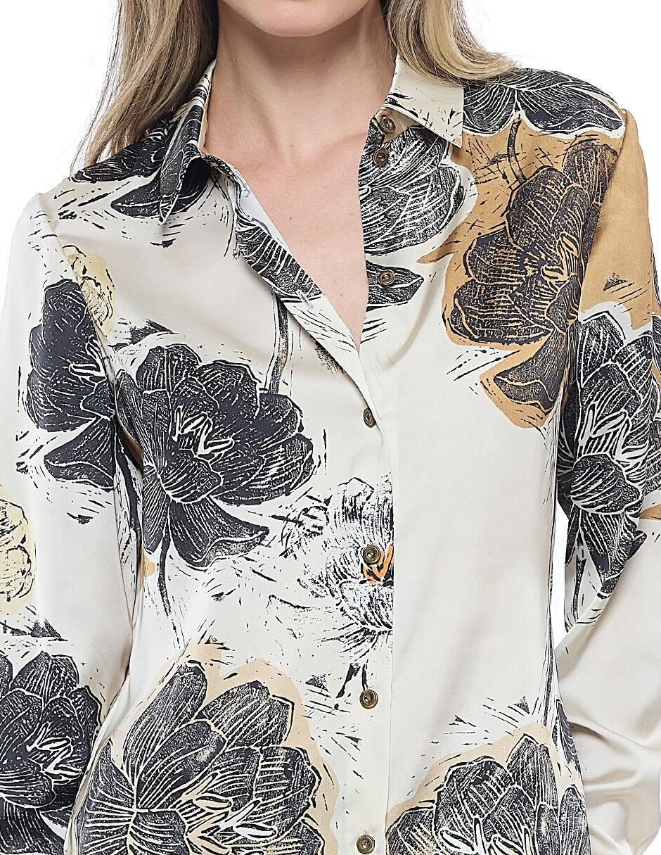 Blusa camisera estampada color hueso, abertura en costados, y manga larga con puño
