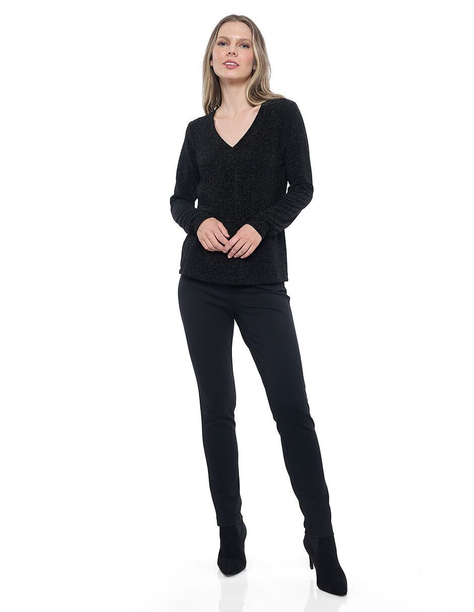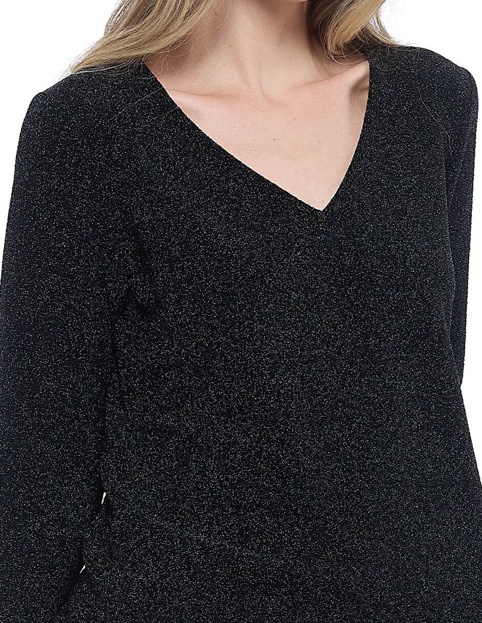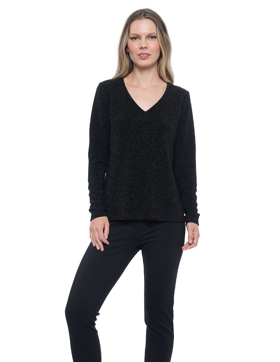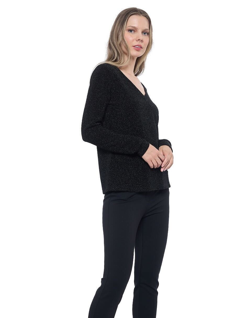 Blusa lycra lisa color negro con lurex, escote V,y manga larga