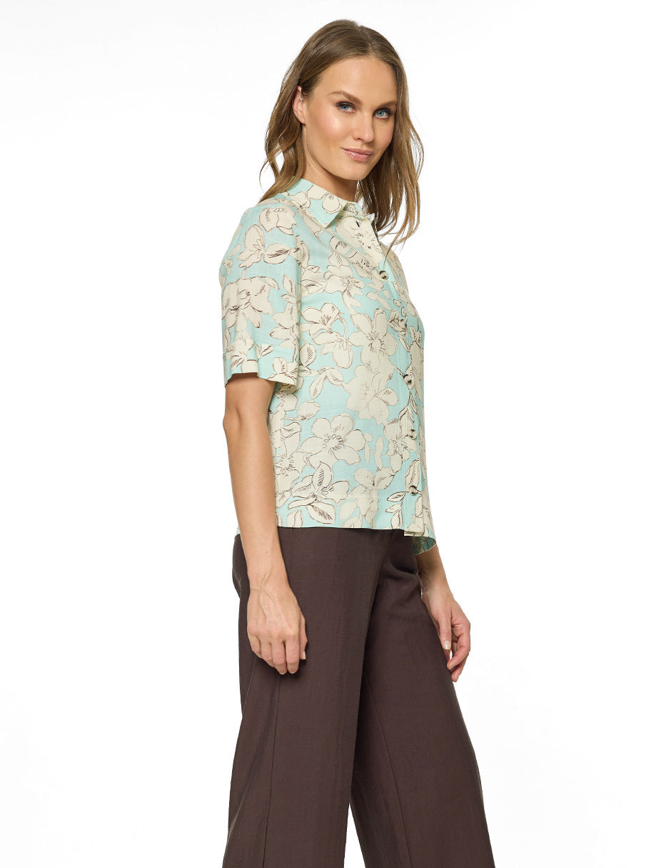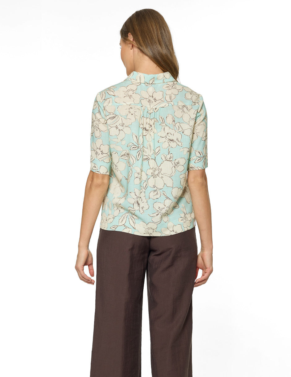 Blusa estampada, cuello camisero, aletilla al frente con botones, bata trasera con pliegues, manga capri con puño