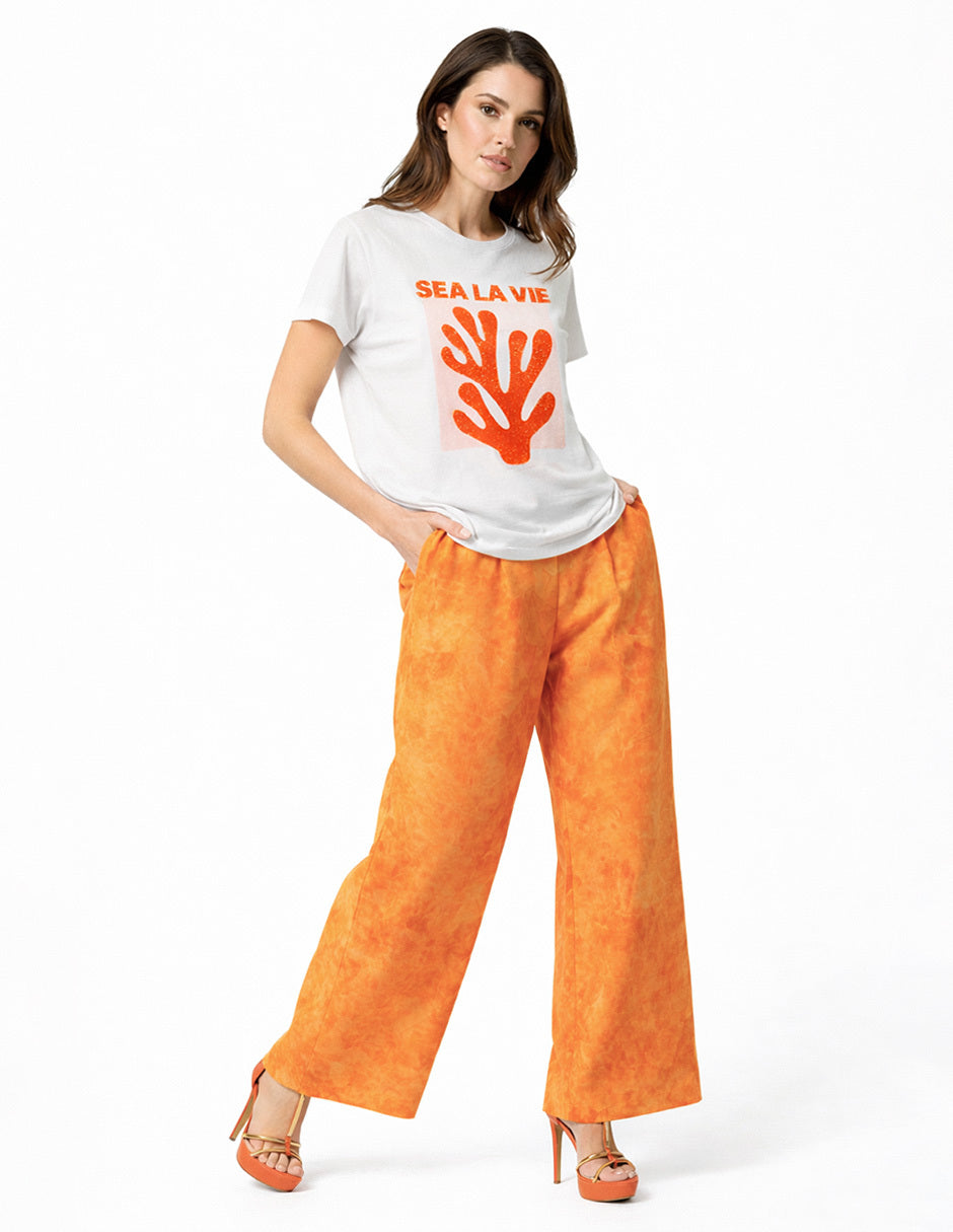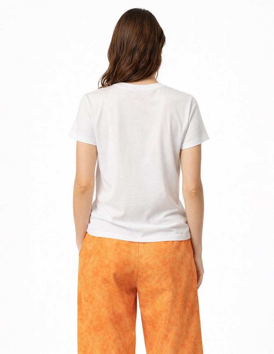 Blusa lycra lisa, escote redondo, estampado y letras con transfer, manga corta