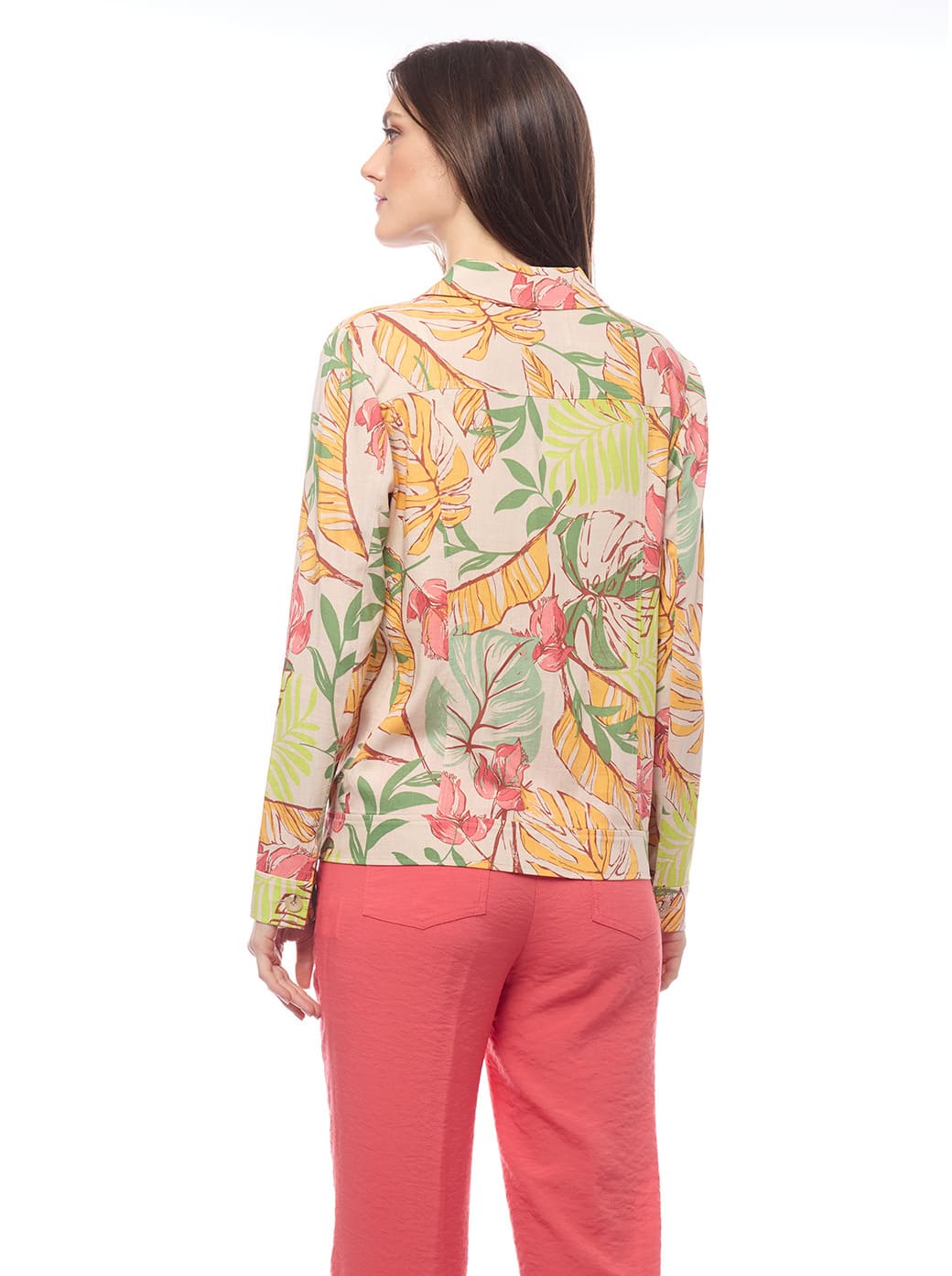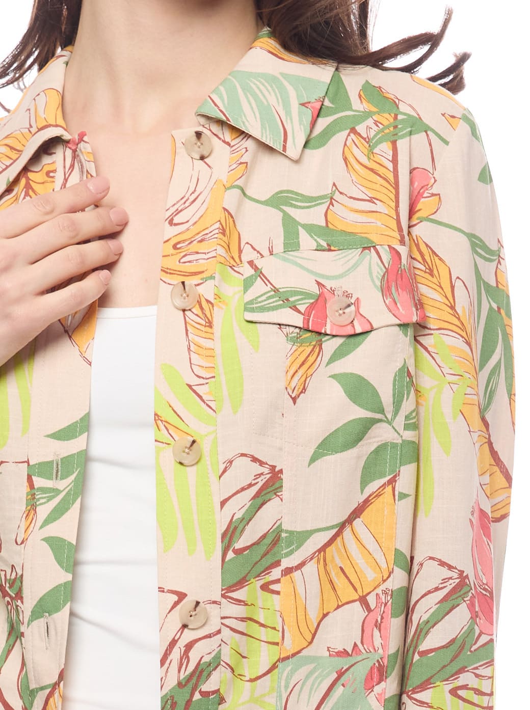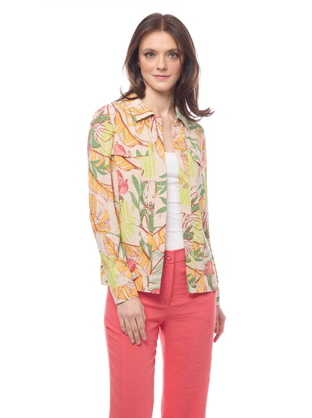 Chamarra estampada color beige, cuello sport, aletilla al frente, canesú y cortes en talle, bolsas con carteras, y manga larga con puño
